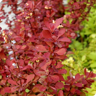 Саженцы барбариса Тунберга Red Carpet украсят красным ковром любой ландшафт. Этот кустарник небольшой: максимально достигает 1-1.5 м в высоту. Примечательным в барбарисе этого сорта является его красивыё ярко-красный цвет, который осенью становится багряным. Жёлтые цветки на кусте появляются в конце мая, а блестящие красные плоды – в начале сентября. Крупномеры Red Carpet хорошо переносят полутень, но чтобы сохранить яркий окрас растения, стоит сажать его на солнечных участках. Почву лучше подготавливать хорошо дренированную. Зимостоек, терпеливо переносит засуху.