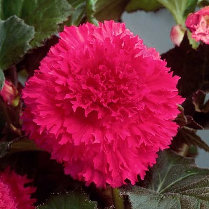 Бегония Фимбриата Пинк – прелестное клубневое растение с изящными резными листьями и огромными гофрированными цветками густого розового цвета. Пышные цветочные шапки эффектно выделяются на фоне темной зелени глянцевой листвы.