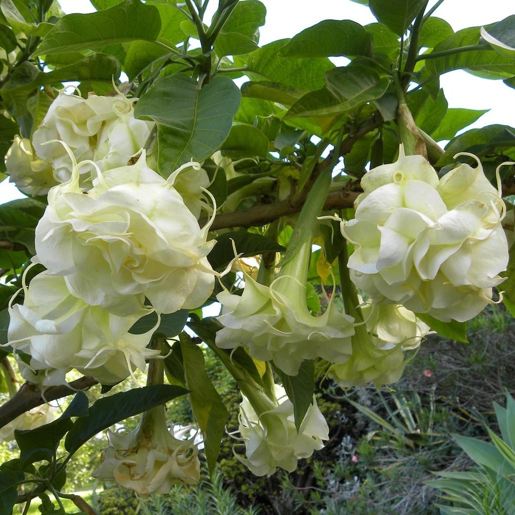 Brugmansia Angel‘s Summerime - декоративный кустарник. Цветки огромные, нежные, махровые, сочетают в себе от чисто-белых до кремовых и оранжево-кремовых оттенков. Окончания лепестков очень длинные, отличаются более насыщенным окрасом.