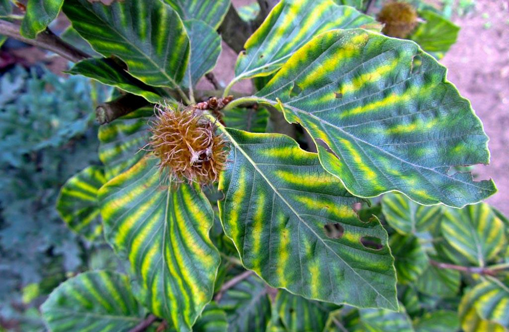 Листья довольно крупные, длиной 8-10 см, жесткие, эллиптические или яйцевидные по очертаниям, изначально светлые. зеленый весной, позже быстро становится двухцветным, полосатым, потому что между зелеными зонами, тянущимися по боковым нервам, видны резко разграниченные, широкие, желтые или желтовато-зеленые полосы; все желтоватые листья побегов можжевельника.