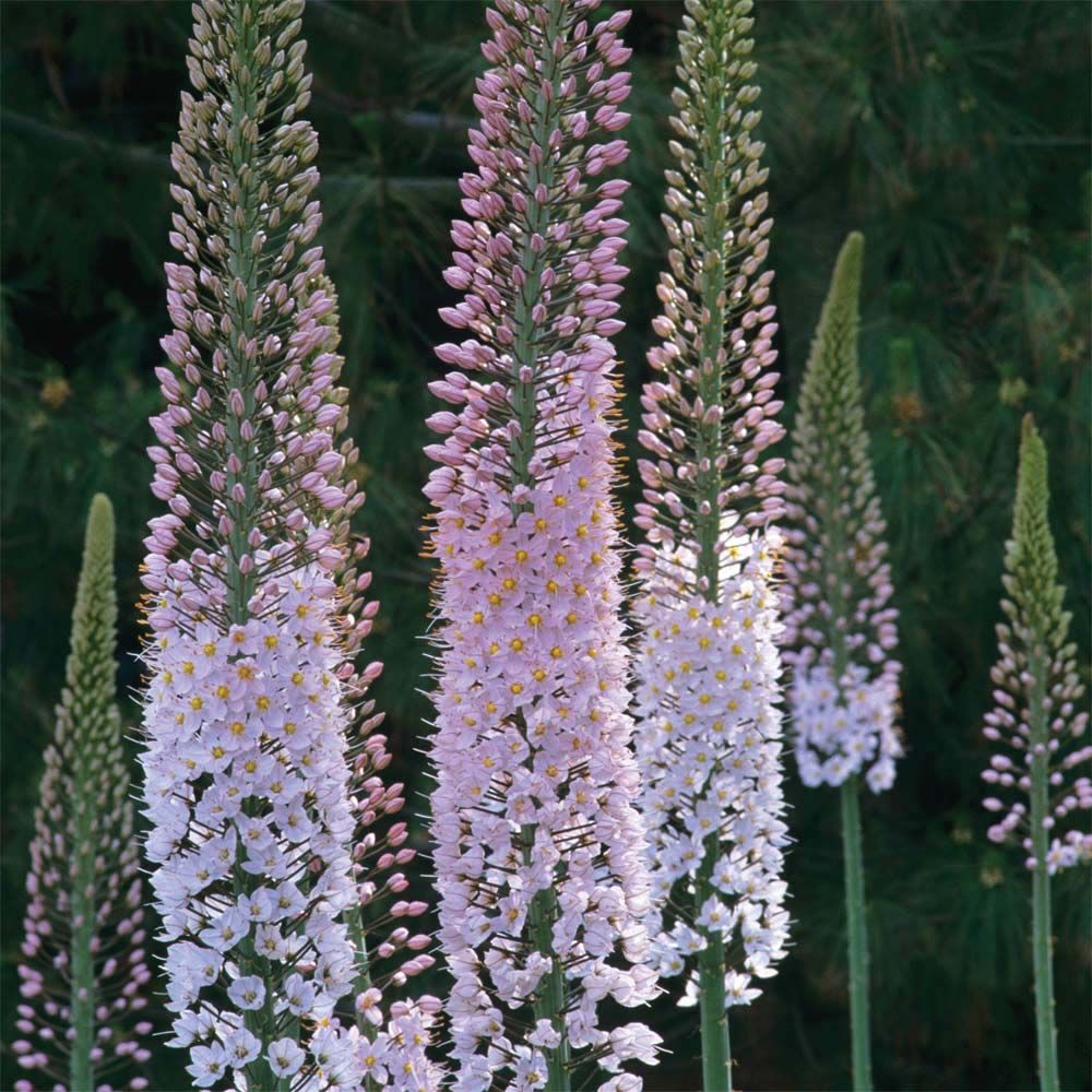 Эремурус Фокстрот (Foxtrot) принадлежит к раннецветущим луковичным растениям. Вырастает до 1,5-2,5 м в высоту. Период цветения – апрель-май, а размер цветов 10-12 см в диаметре. Окраска цветков колеблется от нежно розового до ярко-розового с хорошо выраженной махровостью на концах лепестков. Они имеют приятный, нежный запах. Рассада эремуруса "Фокстрот" предпочитает произрастать на плодородных влажных почвах на солнечной стороне. Высаживают луковицы осенью (октябрь-ноябрь).
