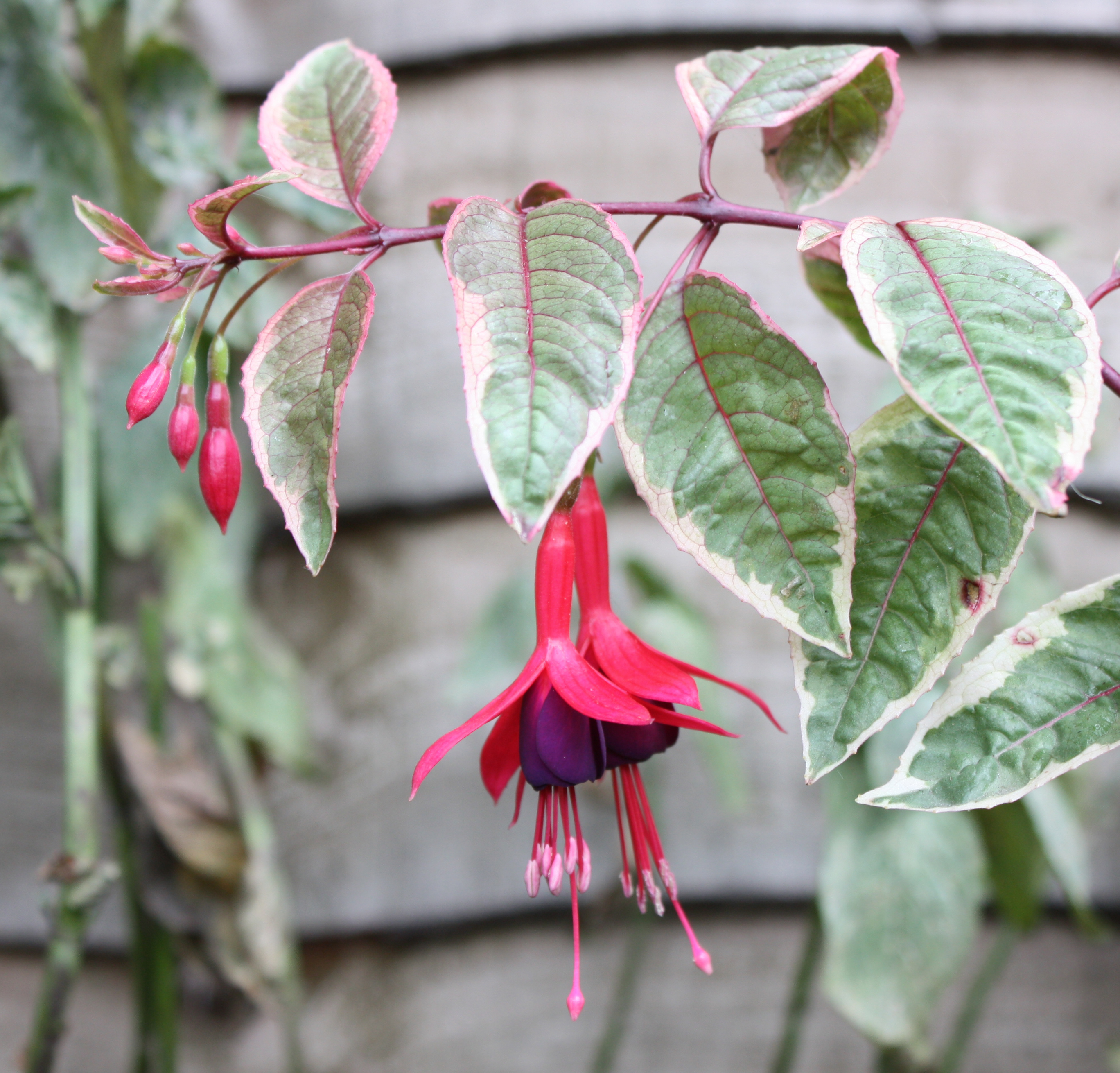 Фуксия Том Вест - кустовая и ампельная формы, бутоны удлиненные, цветки простые, яркого розово-красного цвета. Листья светло-зеленые с желто-розовой окантовкой
