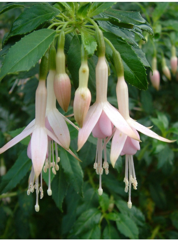 Фуксия Вайт Кнайт Перл/Whiteknight’s Pearl - ампельная мелкоцветковая фуксия нежнейшей розовой расцветки. Кончики чашелистиков нежно-салатовые.