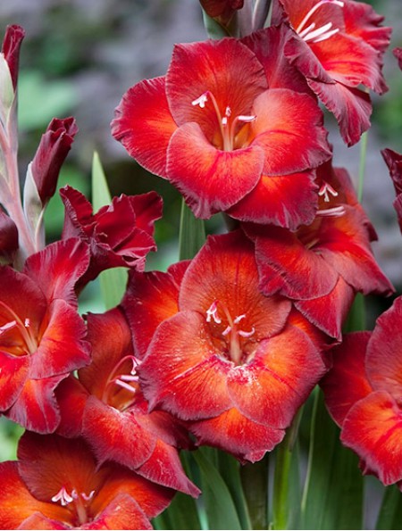 Гладиолус Азурро – растение высотой 100см. Имеет вертикальный неветвящийся стебель и линейные листья. Привлекает внимание крупными и пышными ярко красными цветками с темными краями, диаметром до 14см, собранными в вертикальные соцветия.