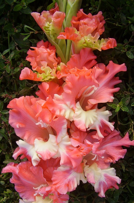 Гладиолус Фризлд Корал Лейс - сильно гофрированные цветки розовые цветки с белым пятном на нижнем лепестке, собранные в стройный колос. В соцветии 21 бутон (10 одновременно открыты).