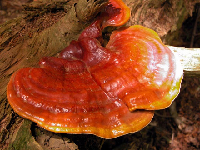 Гриб Рейши обладает сильным противоопухолевым действием. плодовые тела однолетние, изредка 2-3 летние, шляпконожечные. Шляпка (3-8)x(10-25)x(2-3) см, почковидная или почти яйцевидная, плоская. Кожица гладкая, блестящая, неровная, волнистая, разделённая на множество концентрических колец роста, имеющих различные оттенки. Мякоть гриба рейши очень плотная и деревянистая, охристого цвета, без запаха и вкуса. Гименофор трубчатый с мелкими и округлыми порами по 4-5 на 1 мм?. Трубочки короткие, охряные. Ножка 5-25 см в высоту, 1-3 см в диаметре, боковая, длинная, цилиндрическая, неровная и очень плотная. Споровый порошок коричневый.