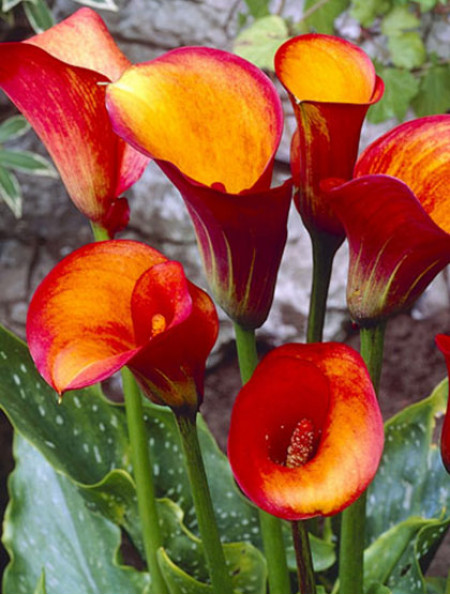 Калла Флэйм - ярко-окрашенная калла высотой не более 55 см. Над темно-зелеными листьями с многочисленными белыми точками возвышаются бокаловидные цветки-початки, окруженные изящным покрывалом. Внутри оно желтое, а снаружи оранжевое с переливами в желтый.