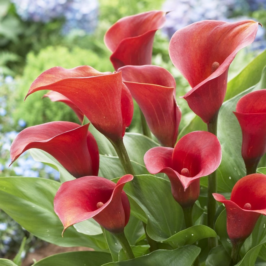 Калла Маджестик Ред (Calla Majestic Red) подарит саду замечательное тропическое растение родом из Южной Африки. Этот многолетник вырастает до 60 сантиметров в высоту. Растение имеет миндалевидные листья крупных размеров и воронкообразные цветки ярко-красного цвета (соцветие внутри в виде початка молочного оттенка). Природный глянец цветов и листьев придает Каллам шарм и благородство, они будут центром внимания как в срезанном букете, так и на клумбах, или в оформлении бассейнов, фонтанов. Цветы любят солнечные участки, с возможным затенением, полив и удобрение на период развития. Осенью луковицы извлекают из почвы для хранения в темном и прохладном месте до весны.