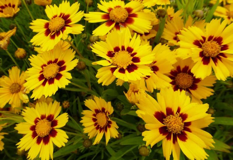 неприхотливый в уходе и к составу почв. Цветок простой формы, но край лепестков резной, а их золотисто-желтый оттенок с бордовым основанием прекрасно гармонирует с сочно-зеленой листвой. Кореопсис ланцетовидный Бэби Голд в жаркие дни требует полив, так цветущий куст дольше сохраняет свой декоративный вид.