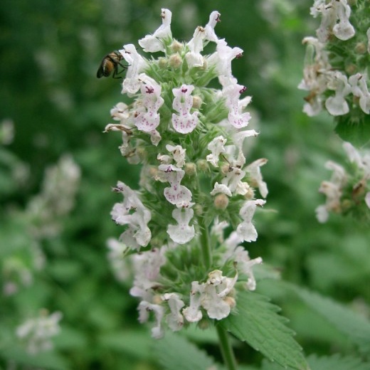 Котовник Alba. Окрас цветков белый с мелким темно-розовым крапом. Листва зелёная, продолговатая с зубчатыми краями. Цветение приходится на все лето и первый месяц осени.