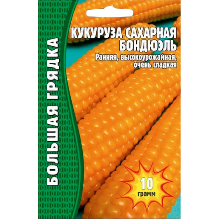 Кукуруза cахарная Бондюэль Ранний, высокоурожайный сорт. Срок созревания около 100 дней. Растение высотой 1,6-2 м. Початки длиной 18-20 см, массой около 200 г. Зерно желтого цвета, крупное, необычайно сладкое, с тонкой нежной кожицей, высоких вкусовых качеств, богато сахарами, белками, витаминами В2 и PP. Идеально подходит для употребления в свежем виде и консервирования и заморозки. Сорт устойчив к резким переменам погодных условий.