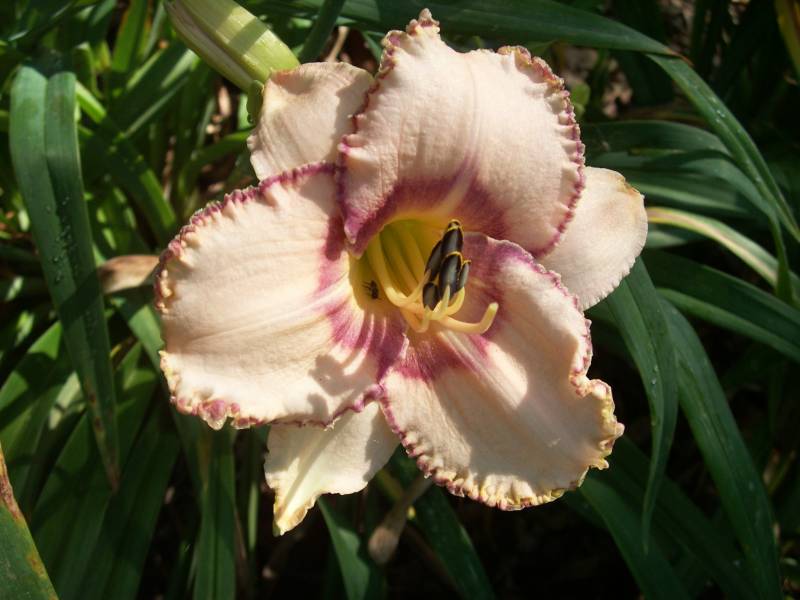Саженцы лилейника New Quest по вегетации являются вечнозелеными, и требуют в зимнее время стабильного снежного покрова. Вырастают до 65 см. Цветы в диаметре достигают 15 см, имеют кремово-розовый цвет, они с пурпурным глазом и каймой, гофрированным краем и зеленым горлом. Место для посадки нужно открытое, хорошо освещенное. Растение любит солнце, цветок на солнце открывается полностью, окраска проявляется четче. Почва для посадки крупномера New Quest подойдет садовая, удобренная, не песчаная. Морозостойкое растение, рекомендуется мульчирование в зимний период. Нетребовательно в уходе.