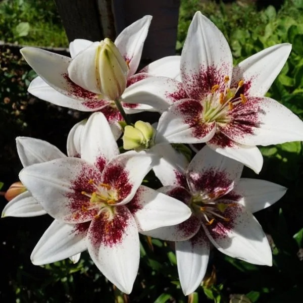 Луковицы лилии азиатской Изи Спот (Easy Spot) достойны того, чтобы пополнить коллекцию даже искушенного цветовода. Словно глоток свежего воздуха, крупные сливочно-белые цветки с бордово-фиолетовым крапом добавят цветнику яркости и свободы. Светло-зеленые тычинки удачно выделяются на фоне лепестков, подчеркивая их яркость. За счет внушительных размеров (высота стебля превышает 100 сантиметров) бутоны хорошо видны даже на заднем плане цветника. Сорт Изи Спот начинает цветение в июле, демонстрируя своё великолепие до конца августа. Лилия азиатская Танго Изи Спот неприхотлива, луковицы благополучно зимуют в почве при температуре минус 29 градусов.