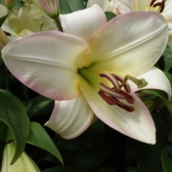 Лилия Boogie Woogie относится к гибридам, пользуется огромным спросом и положительными отзывами среди садоводов. Период цветения приходится на июль-август, образуя прелестные крупные цветы диаметром 23-30 см нежно-желтого оттенка с оранжево-розовой каймой по краям широких, закрученных лепестков. В различных условиях выращивания кайма может проявится, а может и нет. Особенную черту цветку придают темно-бордовые пыльники. Аромат чарующий, сладкий. Продолжительность цветения 15-20 дней. Высота растения достигает 120-150 см, тонкие листья темно-зеленого цвета густо-расположены вдоль прочного стебля. Лилия этого сорта способна длительное время сохранять свежий вид и силу аромата в вазе, букет шикарных цветов будет радовать глаз до 2х недель.