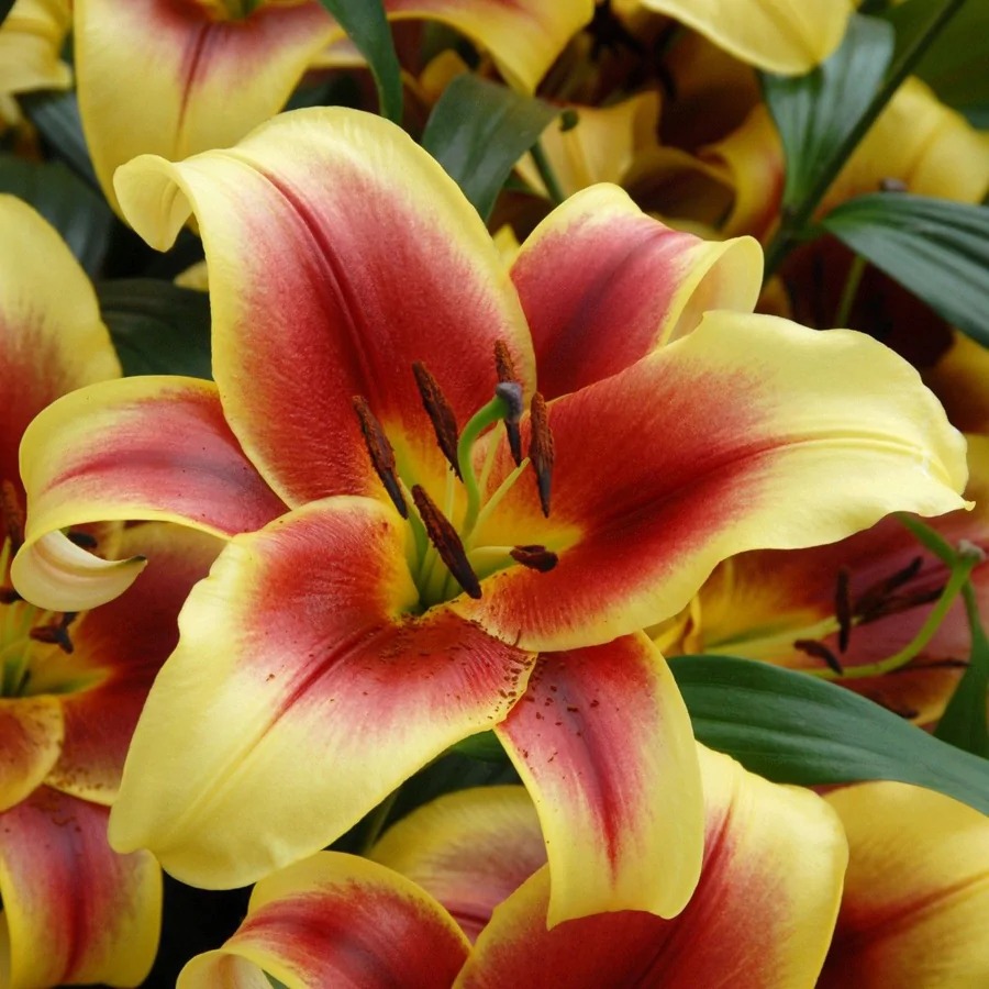 Луковицы лилии ОТ-гибрид Флавия (Lilium OT-hybrids Flavia) хорошо приживутся на нейтральной или слабокислой почве с хорошим дренажем и богатым содержанием питательных веществ. Период цветения начинается ближе к середине июля. Цветки размером около 25 см составлены из плотно пригнанных двух трехлепестковых чаш разной формы. Те, что ближе к солнцу, раскрываются шире и меньше загибаются на кончиках. Расцветка основания лепестков зеленая, основной цвет кремово-желтый с крупным темным винно-красным пятном в середине. Высота Лилии ОТ-гибрида Флавия в целом 120 см. Хорошо выглядит в срезке, смешанных и групповых посадках.