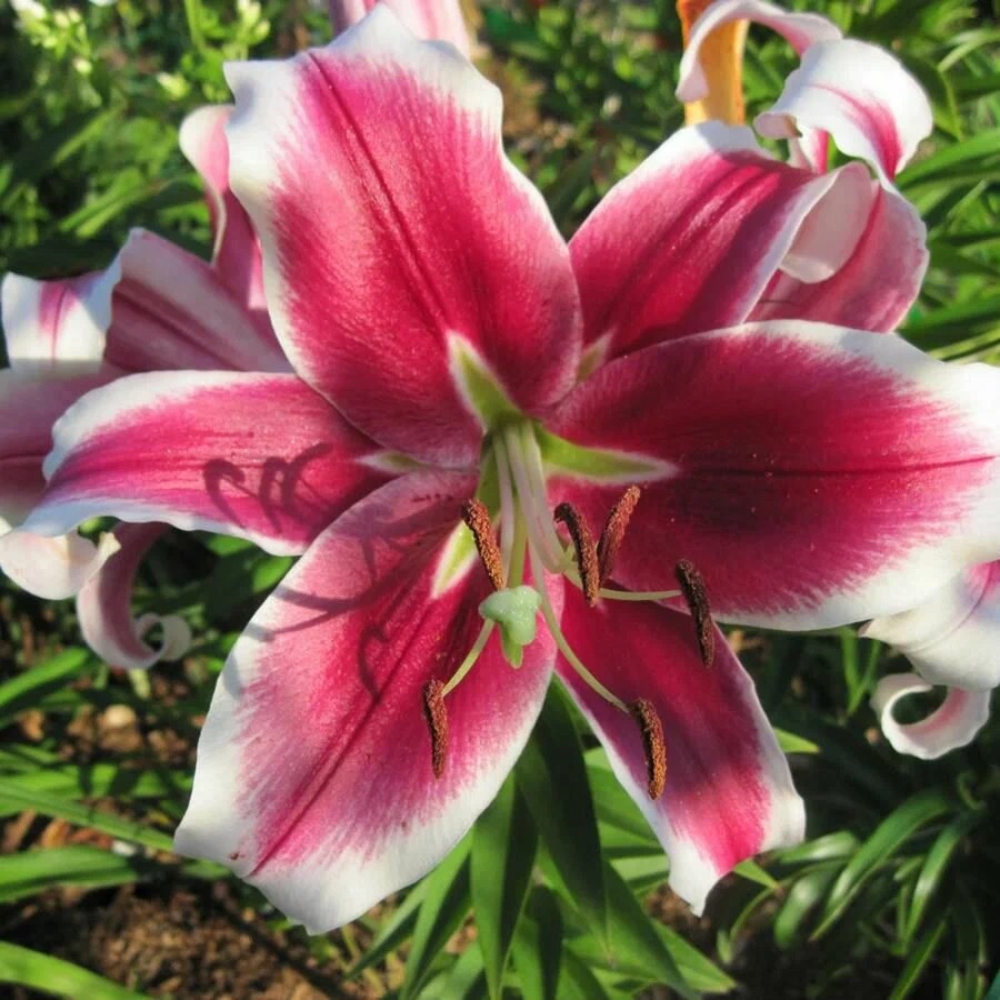 Луковицы лилии ОТ-гибрид Флэшпоинт (Lilium OT-hybrids Flashpoint) хорошо впишутся в сад с обилием зелени. В августе начинают раскрывать первые бутоны крупных, до 18 см в диаметре, ярких цветов. Окраска лепестков делает это растение поистине королевским. Темно-розовые винного оттенка лепестки вырастают из нежно-зеленых звездочек основания и заканчиваются чисто-белыми закручивающимися от центра кончиками. Пыльники чуть темнее середины лепестков. Лилия ОТ-гибрид Флэшпоинт отличается прочностью стеблей и обилием бутонов на каждом цветоносе.