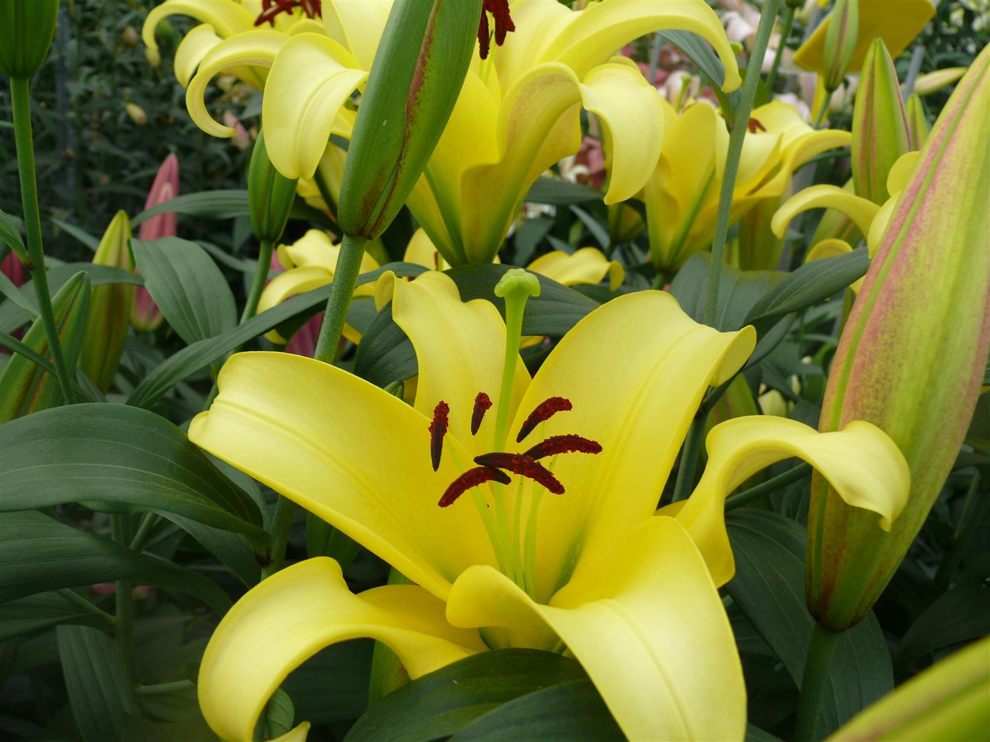 Луковицы лилии ОТ-гибрид Йеллоувин — грациозные цветы, которые привлекают внимание и расставляют правильные акценты в любой цветочной композиции. Период цветения наступает во второй половине лета. На высоких (до 160 см) и прочных стеблях появляется одновременно несколько крупных (до 21 см в диаметре) цветов. Они напоминают бокалы с отогнутыми краями-лепестками. Цветы ярко-желтые, матовые, с эффектными зелеными жилками на наружной стороне и темными контрастными пыльниками. Лилия ОТ-гибрид Йеллоувин отлично адаптируется в условиях умеренного климата и может переносить зиму в открытом грунте (под укрытием). Особенно пышное цветение наблюдается под открытыми солнечными лучами. Также желательно подкармливать растения комплексными минеральными смесями.