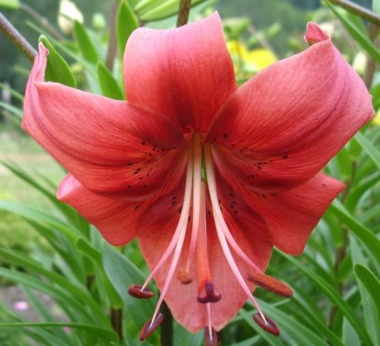 Лилия Pearl Loraine - тигровый гибрид. Цветет обильно в июле. Высота растения - 120-150 см и, возможно, выше. На цветконосе есть около 25 цветков. Диаметр цветка - 15-16 см. Цветки чашевидной формы с закрученными плотными лепестками, сложное и красочное сочетание коралово-розового, оранжевого и персикового цветов с небольшим темным крапом в центре. Цветы очень яркие, насыщенного цвета. Сорт морозостойкий.
