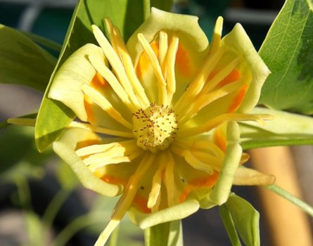 Лириодендрон Aureomarginatum - экзотическое, могучее, величественное, компактное, крупное дерево со стройным, ровным стволом и с широкой, пирамидальной кроной. Достигает 25-30 м высоты и 15-20 м ширины, листья 4-лопастные, лировидные. Цветение обильное и длительное, с мая по июль. Цветы необычные, по форме и размеру похожи на тюльпан, крупные, желто-зеленые, с оранжевыми пятнами в основании. Успешно выдерживают морозы до -25°С.