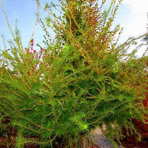 Очень декоративный сорт с нерегулярной плакучей кроной. Хвоя нежная, весной и летом - голубовато-зеленая, а осенью - золотистая. Высота взрослого растения до 2 м.