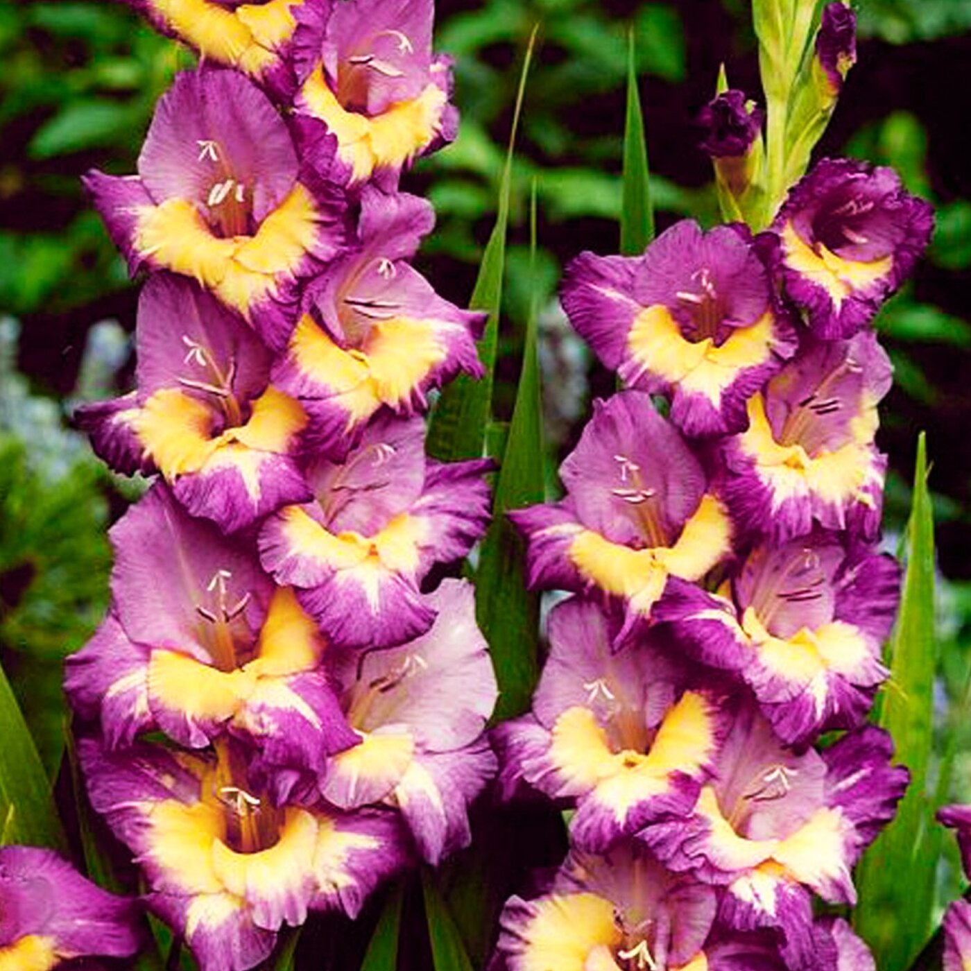 Гладиолус крупноцветковый ДинамитДинамит (Gladiolus) полюбится за свою неординарную окраску. Смешение сочных желтого и фиолетового оттенка очарует любого человека, даже далекого от садоводства. Вырастающий колос имеет 16-20 огромных бутона, которые распускаются группами по 3-5 штук. Срезают Динамит тогда, когда на растении распустятся 2-3 цветка. В этом случает, оно дольше простоит.