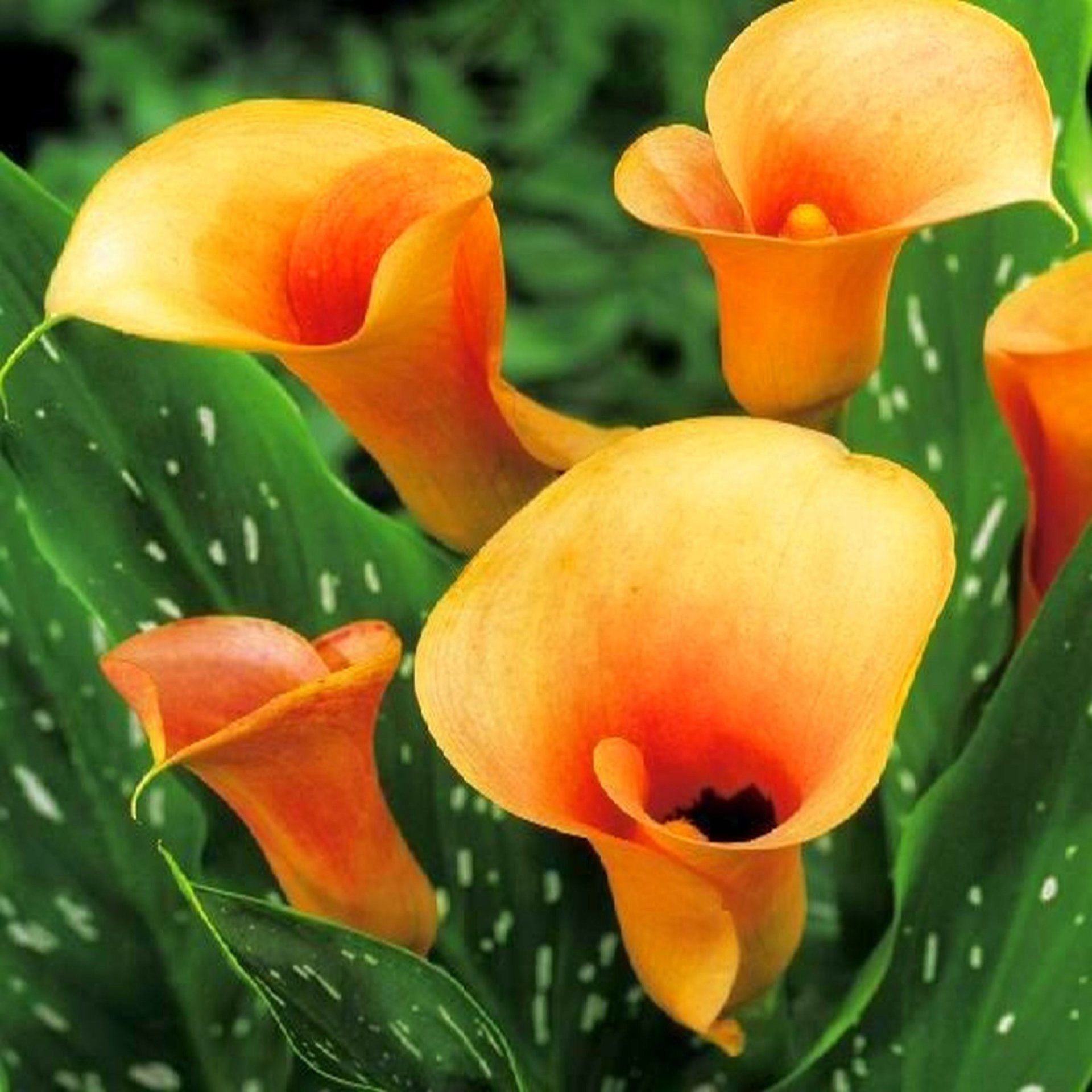 Клубни Каллы обыкновенной Хамелеон (Calla Cameleon) – это прекрасный способ оригинально оформить придомовую зону загородного коттеджа или сада, а также водоемов и фонтанов. Данный многолетник обладает роскошными восковыми листьями стреловидной формы и одиночными соцветиями, которые располагаются на высоких цветоносах – в виде оранжево-желтых воронок. Калла вырастает до 50-60 сантиметров в высоту, размер цветка достигает 12-17 сантиметров. Калла Хамелеон любит питательные почвы, регулярный полив и дренаж, слегка затемненные, но прогреваемые солнцем места. На зимовку клубни цветов вынимают из земли и хранят в темном, прохладном месте.
