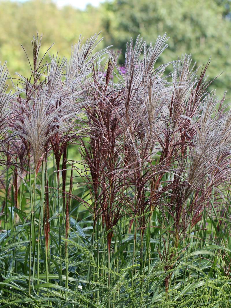 Мискантус китайский: мощный, короткокорневищный, рыхлокустовой многолетний злак с прямостоячими, облиственными в нижней части стеблями до 300 см высотой. Листья линейные, до 1,5 см шириной, с толстым ребром посередине, жесткие, шершавые. Колоски одноцветковые, до 0,7 см длиной, в рыхлых метелках с укороченной главной осью. Практически все мискантусы имеют длительный период декоративности - с весны до поздней зимы. Осенью их листва окрашивается в различные оттенки желтого, коричневого, бордового цветов. Отличное растение для образования кулис.