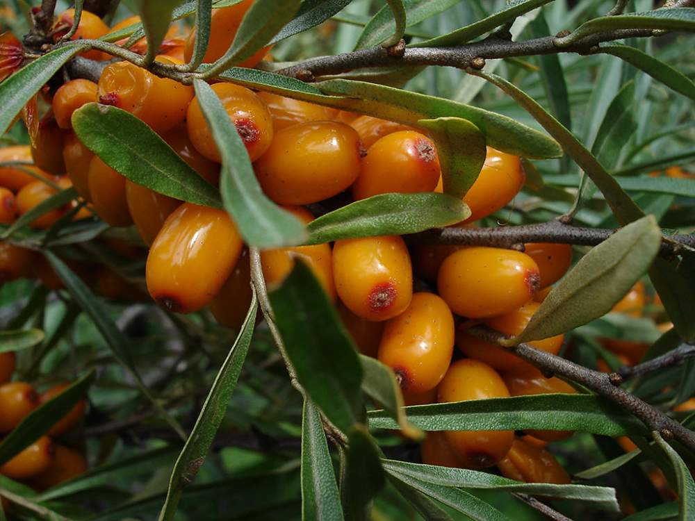 Облепиха Чечек - позднего срока созревания, универсального назначения. Крона раскидистая, колючек нет. Плоды расположены рыхло. Плоды широкоовальные, оранжевые, с румяными пятнами у основания плодоножки, сладкие,