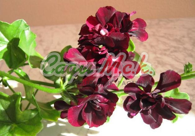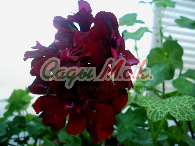 Красивый, свободно разветвляющийся, махровый, плющелистный сорт. Цветки глубокие, бархатисто-фиолетовые с белыми вспышками на большинстве лепестков