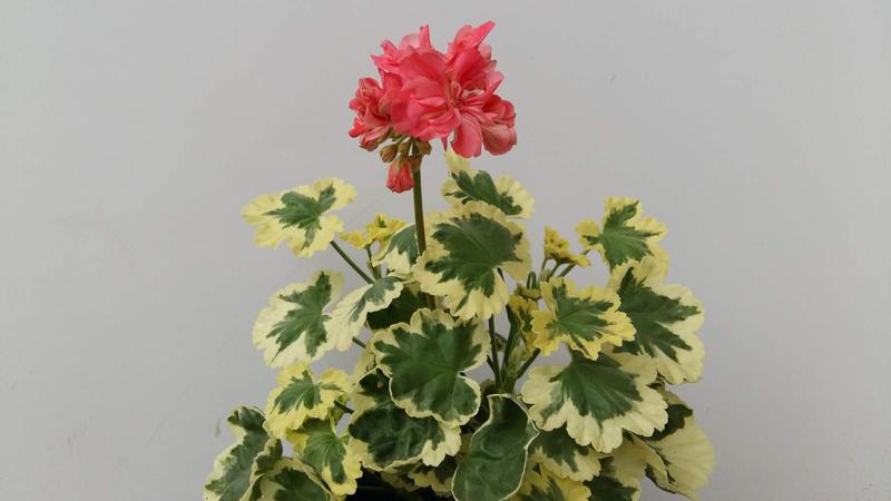 Пеларгония Richard Upward - карликовый пестролистный кустарник. Листья зеленые с толстой кремово-белой окантовкой. Побеги тонкие, бордово-коричневые. Цветки необычной формы, махровые, лососевого окраса с красным жилкованием.