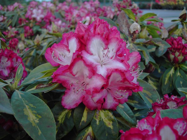 Рододендрон President Roosevelt - популярный сорт растения Рододендрона с нанесением удара разнообразных листьев и связок ярко-красных цветов, которые исчезают к белому в центру. Высота 150-180 см.