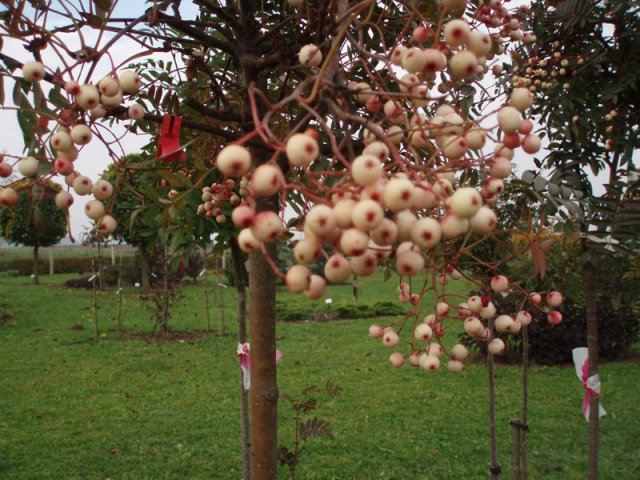 Рябина Coral Pink - крупный кустарник или небольшое деревце с широко-конусовидной кроной, часто с несколькими прямыми, вертикальными мало разветвленными стволами. Цветки белые, собраны в плоские сложные щитки до 15 см. в диамтре. Плоды кремово-розовые, созревают в августе. Листья темно-зеленые, до 20 см. длиной, из 11-15 листочков, глубоко разрезанных у основания на красно-коричневом черешке. Осенняя окраска оранжево-красная. Относительно зимостойка, к почвам в целом нетребовательна.