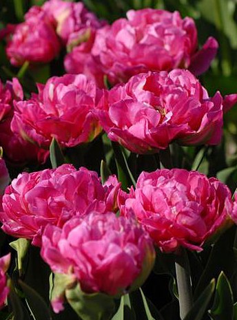 Тюльпан Desirelle - сорт позднего срока цветения. Длина стебля 45 см. Листья темно-зеленые, однотонные. Цветок крупный, густо-махровый, розовый, с множеством лепестков.