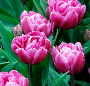Тюльпан Dior - ранний сорт. Высота растения 25-35 см. Период цветения апрель-май. Цветок крупный, махровый, розово-малиновый, похож на пион. Кайма лепестков очень светлая. Размер луковицы 12 см.