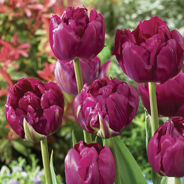 Тюльпан Royal Acres - махровый ранний сорт. Цветок высотой 25-35 см, его диаметр 7-11 см. Цветки красивые, плотные, взъерошенные, махровой формы. Они окрашены в богатый пурпурно-фиолетовый цвет. Цветки больше похожи на пионы, чем на тюльпаны. Их цветение – настоящее зрелище, поэтому эти тюльпаны заслуживают видное место в саду. Отблески серебра на лепестках привлекают внимание к этим богатым, плотным цветкам, которые состоят из 18 лепестков и более. Этот тюльпан выглядит эффектно в любом саду, а также в срезке.