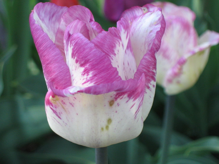 Тюльпан Shirley - простой поздний сорт. Цветок бокаловидной формы. Окраска цвета слоновой кости с пурпурно-сиреневой штрихованной каймой. Высота бокала до 6 см, диаметр бокала до 5 см, высота растения: до 60 см. Сроки цветения - середина - конец мая. Сорт размножается средне. Используется для озеленения и срезки.
