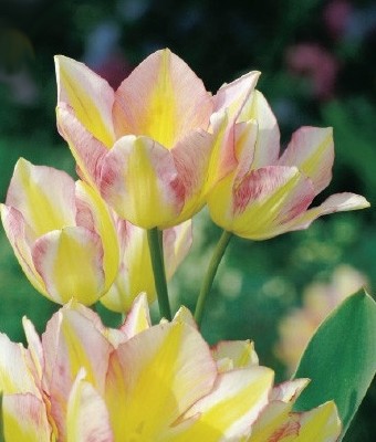 Тюльпан City Flower . Стебель короткий, достигает 30 см высоты. Цветок изменяет окрас по мере распускания и цветения. Бутон насыщенно-желтый, затем края лепестков белеют и розовеют. Форма цветка чашевидная. Стебли и листья зеленые, однотонные.
