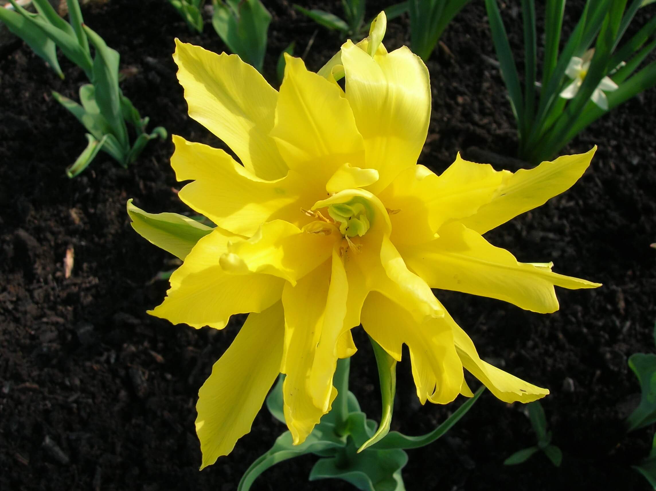 Тюльпан Yellow Spider относится к классу лилиевидных, этот сорт является еще и махровым. Лепестки изогнутые, заостренные на концах, хаотично повернуты в разные стороны. Окрас цветка ярко-желтый. Цветет сорт в апреле-мае. Высота цветоноса 60-70 см, он крепкий и устойчивый к неблагоприятным погодным условиям.