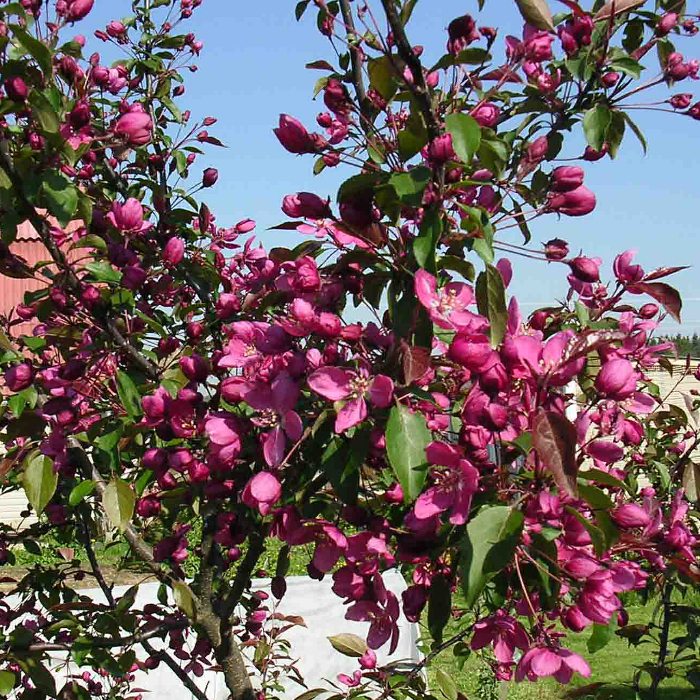 Саженцы яблони декоративной Макамик отличаются густой шатровидной кроной, которая во время цветения очень красива. Этот сорт цветет на пятый год после привития, его крупные бутоны насыщенного розового цвета. Цветения может продолжаться до десяти дней, после начинают формироваться плоды. Мелкие яблочки темно-красного цвета вырастают в диаметре до трех сантиметров, обладают слабым восковым налетом. Данный крупномер морозоустойчив, не боится резких перепадов температуры, также устойчив к разного рода заболеваниям. Этот сорт идеально подойдет для декоративного украшения сада.